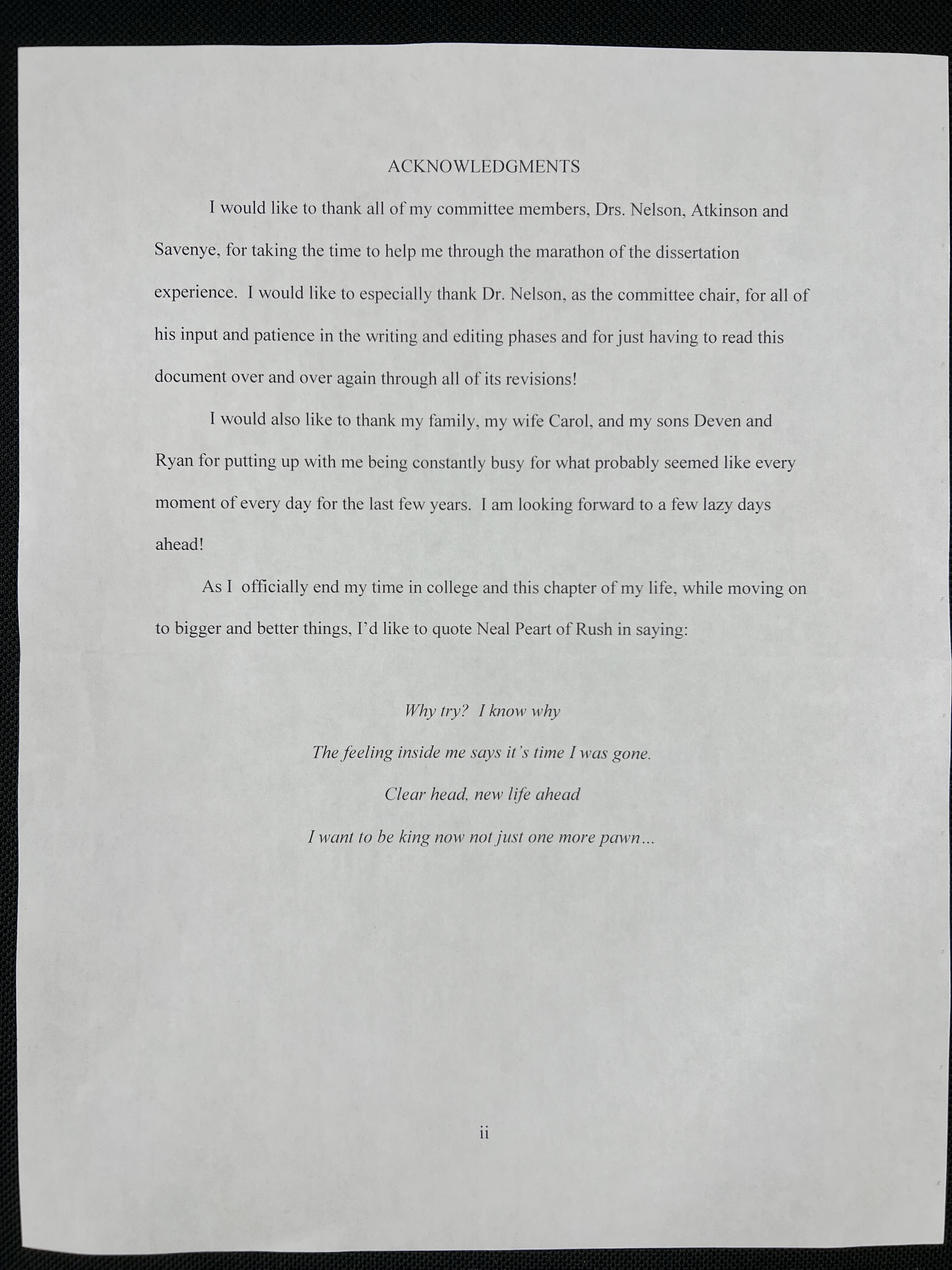 “As I officially end my time in college and this chapter of my life, while moving on to bigger and better things, I’d like to quote Neal Peart of Rush in saying: