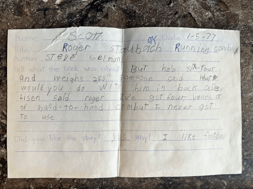 And on that note, I’ll end with one more story to bring the point home. I found this book report he did when he was seven years old on Roger Staubach: Running Cowboy. I love this because he only had to answer two questions. First, “Tell what the book was about” to which Scott responded: “But he’s six-four and weighs 250, someone said. What would you do with him in [a] back alley. Listen said Roger, I’ve got four years of hand-to-hand combat I never got to use.” I searched for this book on Amazon, sadly to no avail. Regardless, I’m not totally sure he understood the question, I’m pretty sure that isn’t what the book was about, and I’m 100% sure that I love the fact that Scott thought that this passage was cool.