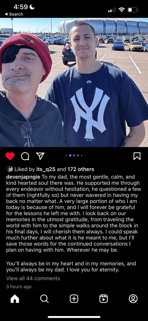 What is even more impressive than how he battled cancer, is how the kid who would walk from church to AJ’s and back for donuts lived his life when the cancer and associated treatments took a pause and he felt better. In the last year and a half alone he traveled to Chicago, New York, Milwaukee, Philadelphia, Charleston, Savannah, the UK, Ireland, Scotland, Spain, Portugal, and Italy. He saw the sphere in Vegas and hiked in Zion. We saw The Cult while I was visiting Arizona. His will to live – to really live – consistently amazed me. Unfortunately, as it so often does, the cancer returned in August, and this time, there were no more treatments to be had.